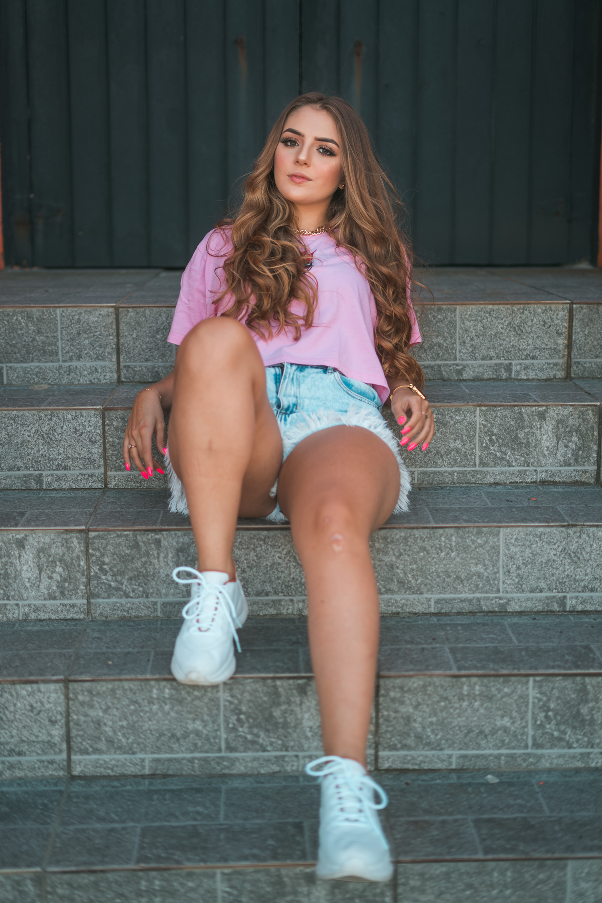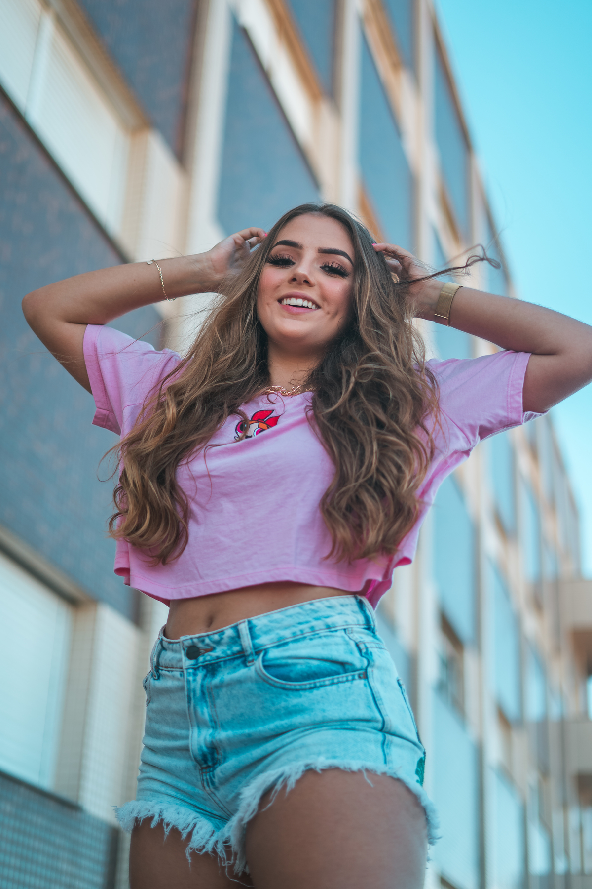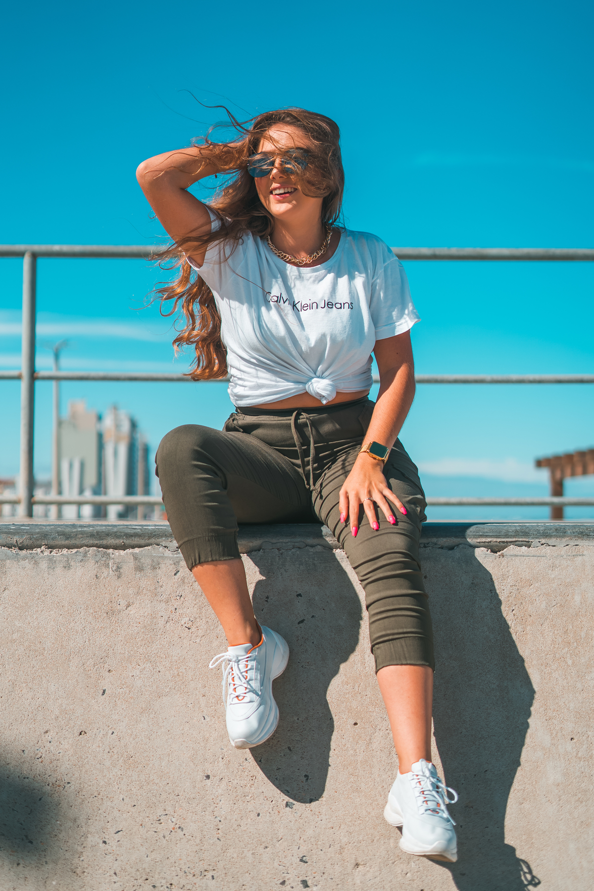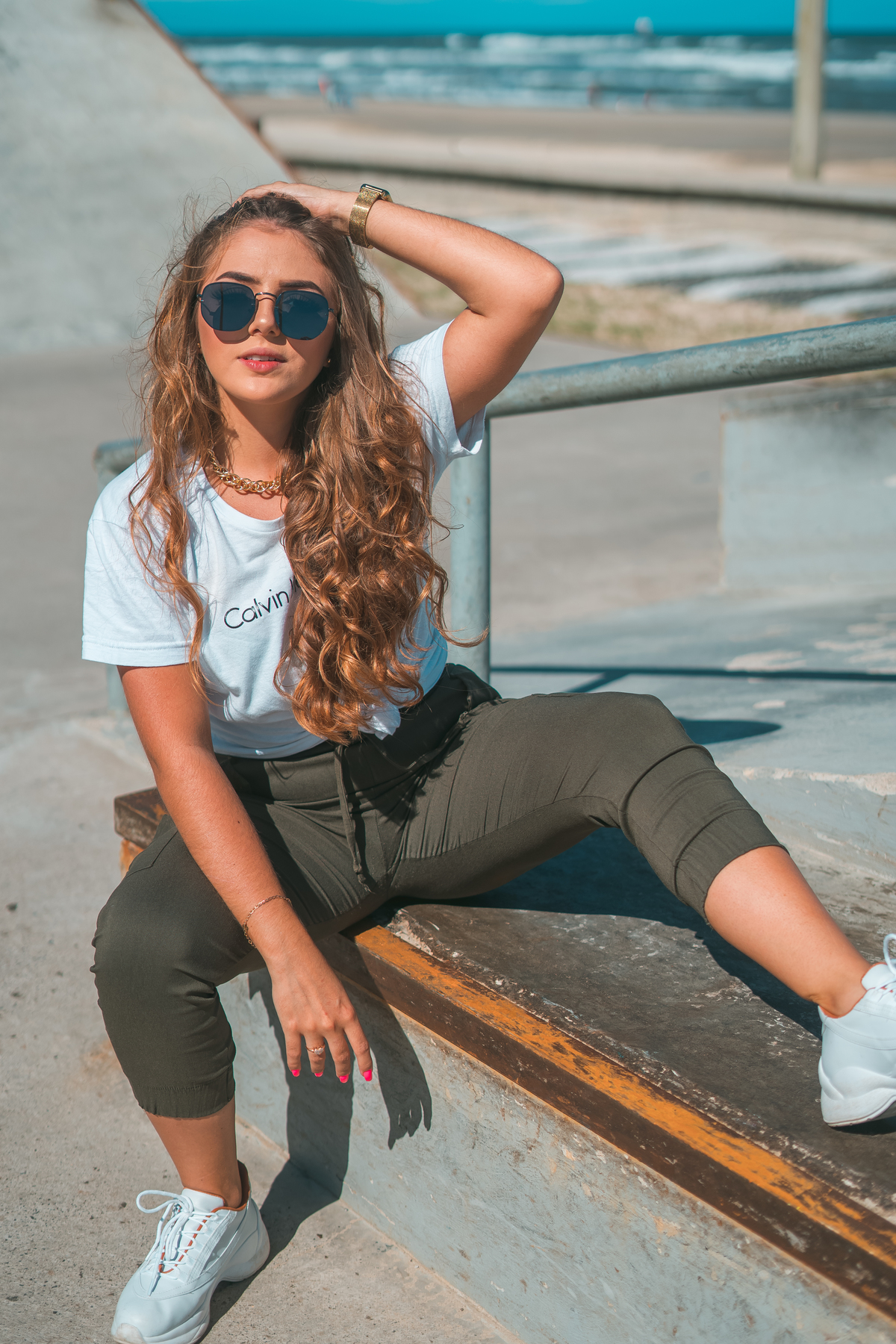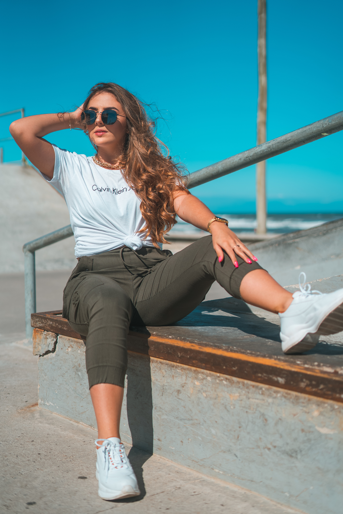 No ensaio da Camilly tivemos várias propostas diferentes. Utilizamos a pista de skate, na frente da praia, e ao redor da pista, prédios, escadas e vidros. Fomos criando a partir do cenário que escolhemos e do que íamos achando legal.