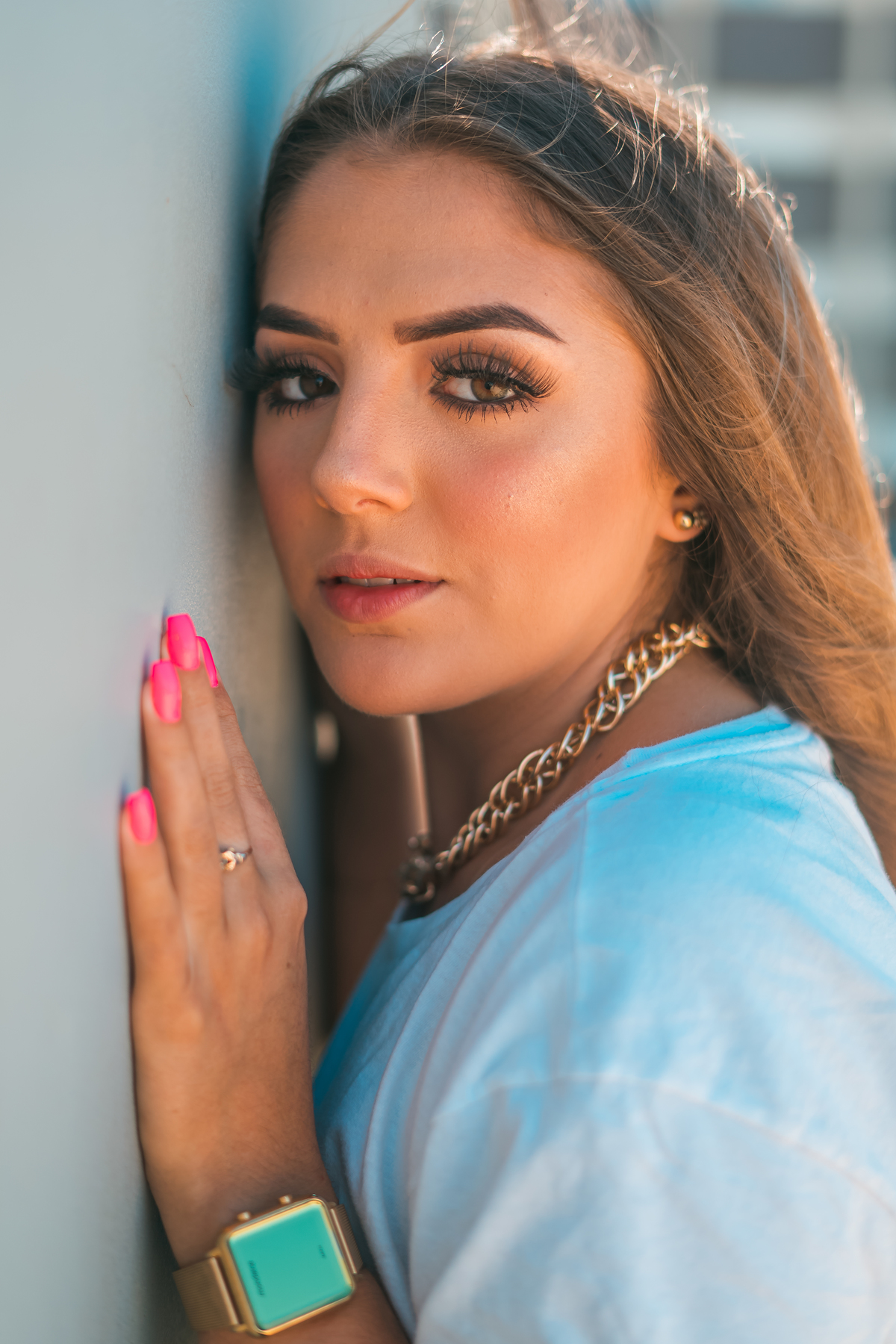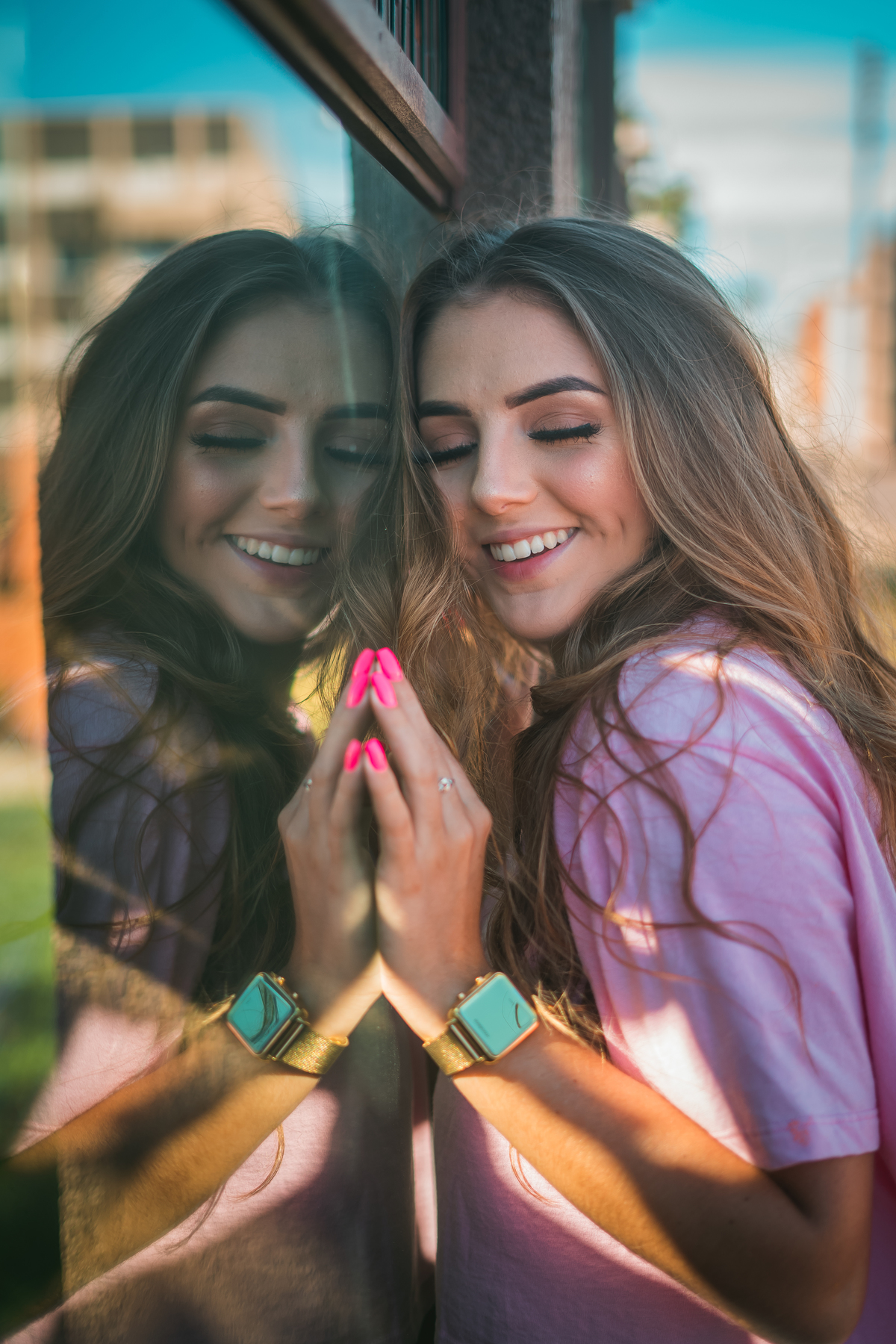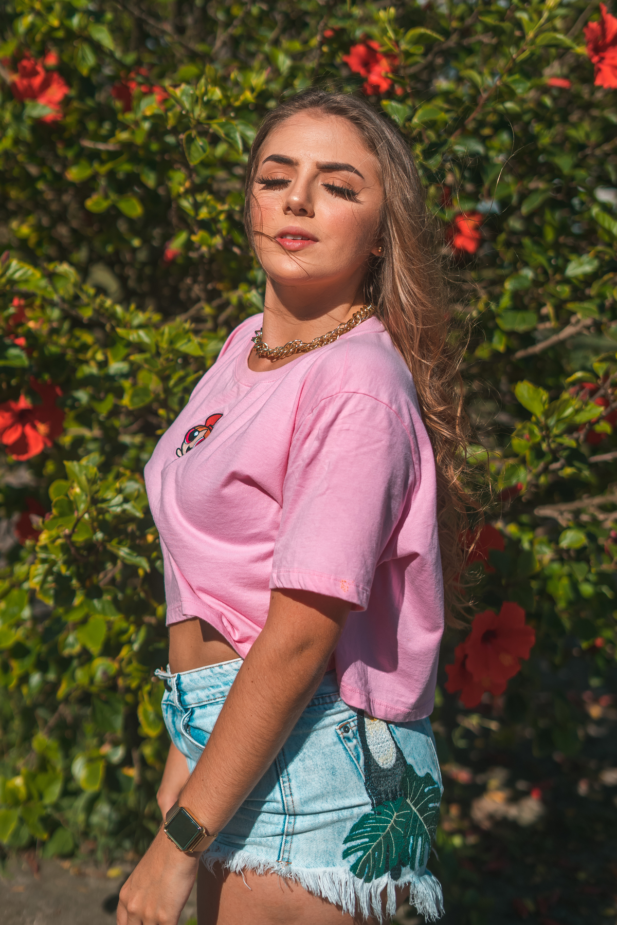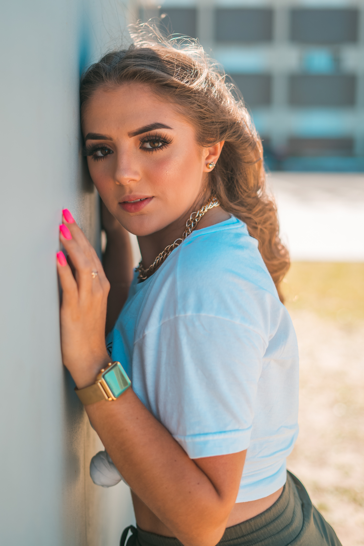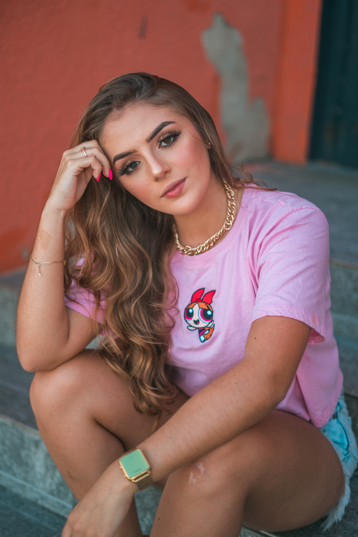 No ensaio da Camilly tivemos várias propostas diferentes. Utilizamos a pista de skate, na frente da praia, e ao redor da pista, prédios, escadas e vidros. Fomos criando a partir do cenário que escolhemos e do que íamos achando legal.